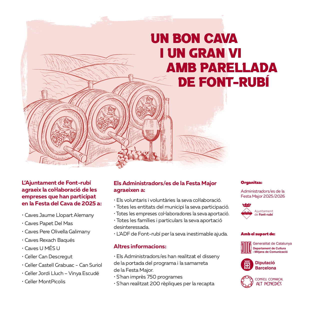 L’Ajuntament de Font-rubí i els administradors/es de la Festa Major de Guardiola 2025 volen expressar el seu més sincer agraïment a totes les empreses, comerços i persones particulars que, amb la seva col·laboració, han fet possible aquesta celebració tan especial per al municipi.